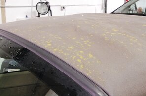 Als das Fahrzeug angeliefert wurde, sah sein Verdeck erheblich schlimmer aus. Er hatte zu sehr gewartet: vorhandene Moosverschmutzungen & zusätzliche Schimmelbildung.