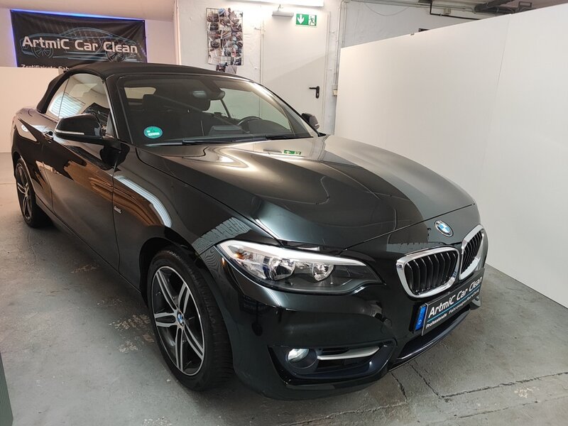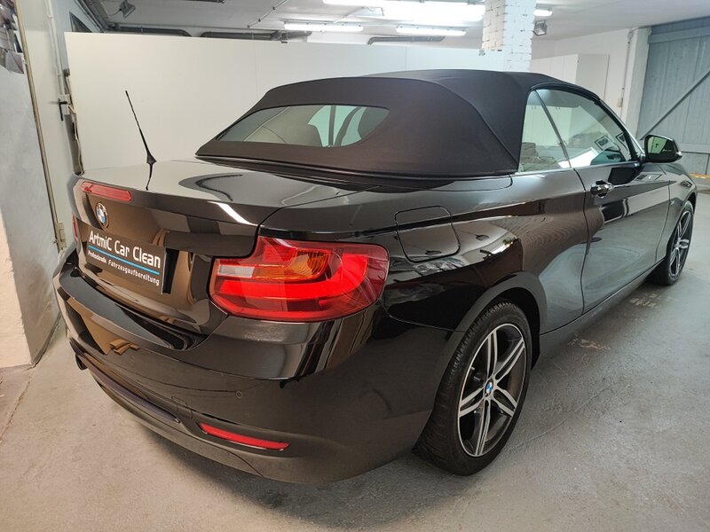 Die Kundin aus Enger wünschte für ihren BMW 218 Cabrio eine saisonale Fahrzeugaufbereitung, Verdeckreinigung und Pflege.