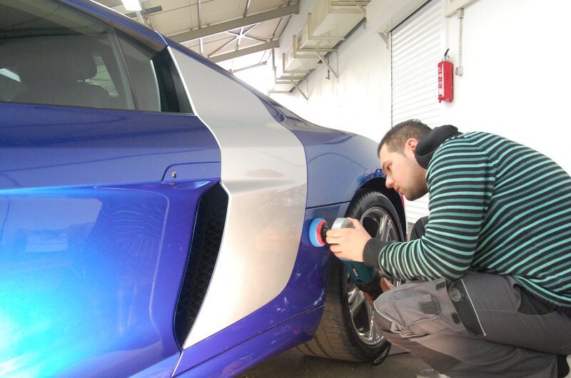 Danny führte als zukünftiger Profi in der Autoaufbereitung / Lackaufbereitung auch eine professionelle Lackbehandlung an dem Audi R8 durch. Er entfernte einige tiefere Kratzer im Lack und auf dem Stoßfänger.