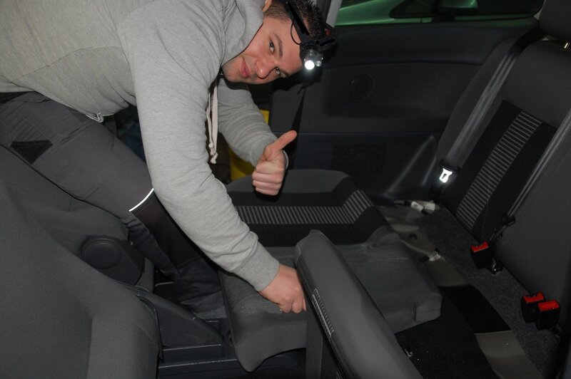 Nach der Autowäsche ging es an die Aufbereitung eines VW Polo: wie reinige ich einen Autoinnenraum, wie entferne ich Flecken von Autositzen (Polsterpflege)? Wie reinige ich professionell den lackierten Bereich unter einer Fahrzeug-Rücksitzbank?