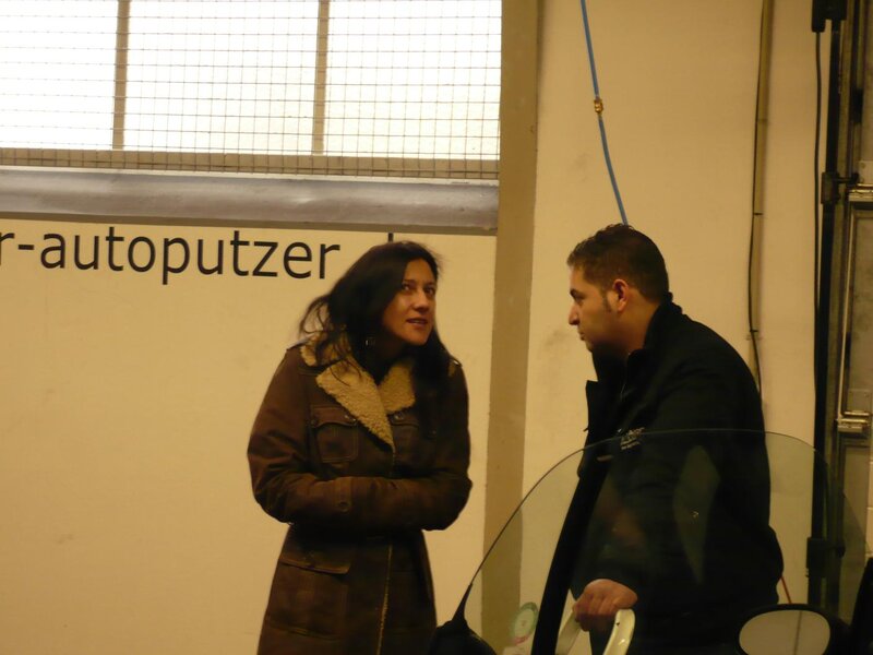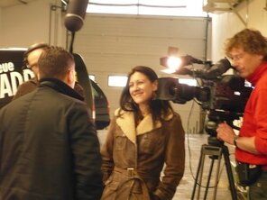 Diana Zulfoghari besucht Autoputzer mit Kamerateam und dem Tontechniker für die Aufnahmen des Cosmo TV auf WDR.
