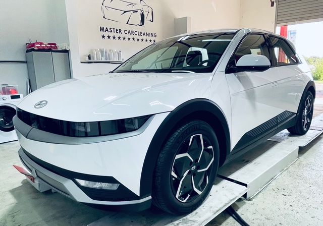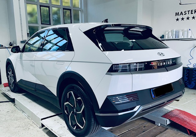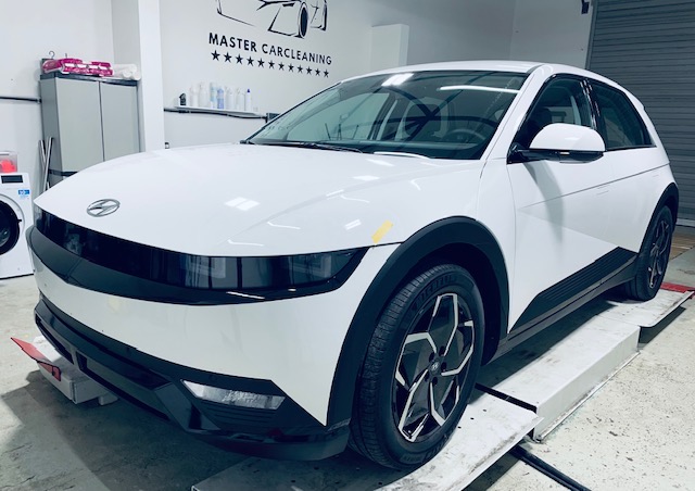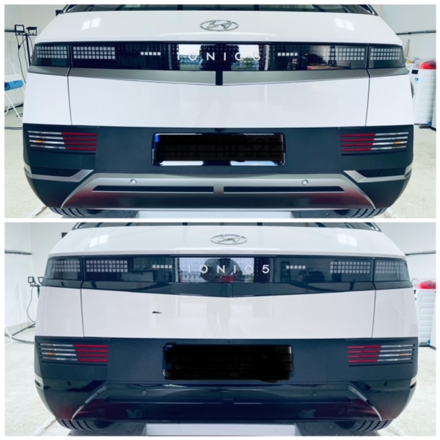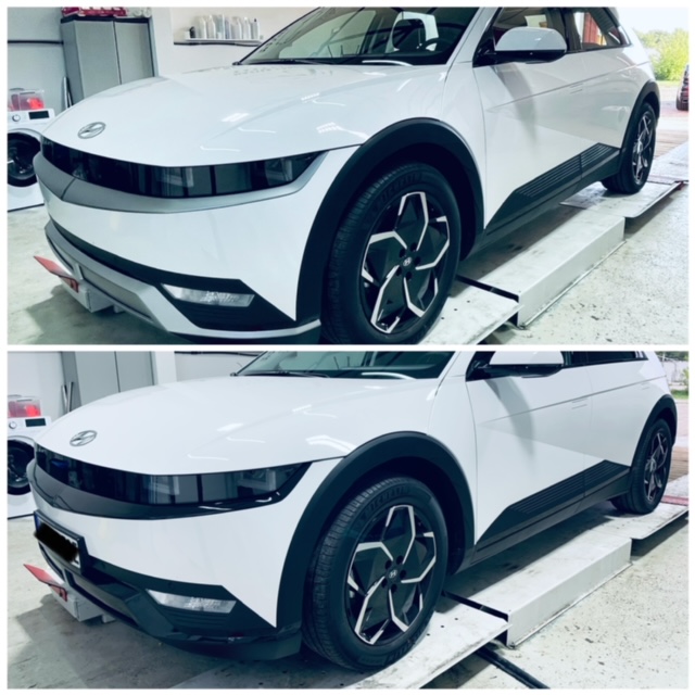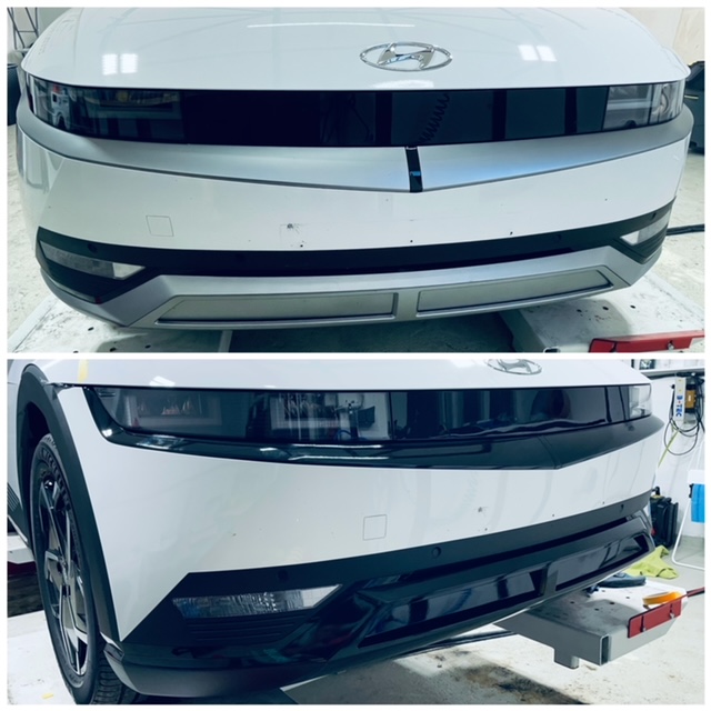 Der Kunde findet die silberne Anbauteile seines Hyundai IONIQ 5 nicht besonders hübsch und gibt den Auftrag, diese Teile in Glanz schwarz zu folieren.