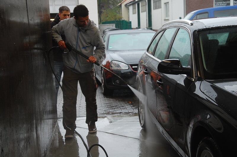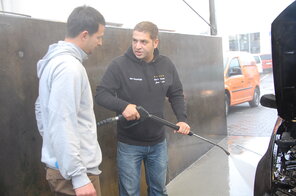 Nachdem Heiko gelernt hat, welche Chemikalien er für die professionelle Autowäsche benötigt, ging es auch sofort los.