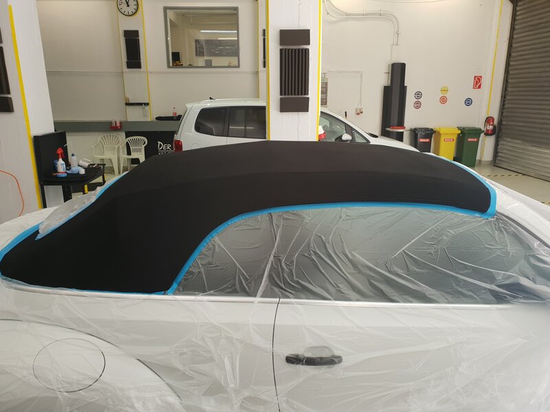 Nachdem das Verdeck gereinigt, entfettet und die Trocknungsphase abgeschlossen ist, beginnen wir mit der kompletten Umhüllung Ihres Fahrzeugs. Diese beinhaltet das Abkleben von Kunststoffbauteilen und zum Schutz Ihres Lackes, denn die Versiegelung darf nicht auf den Lack herunterlaufen.