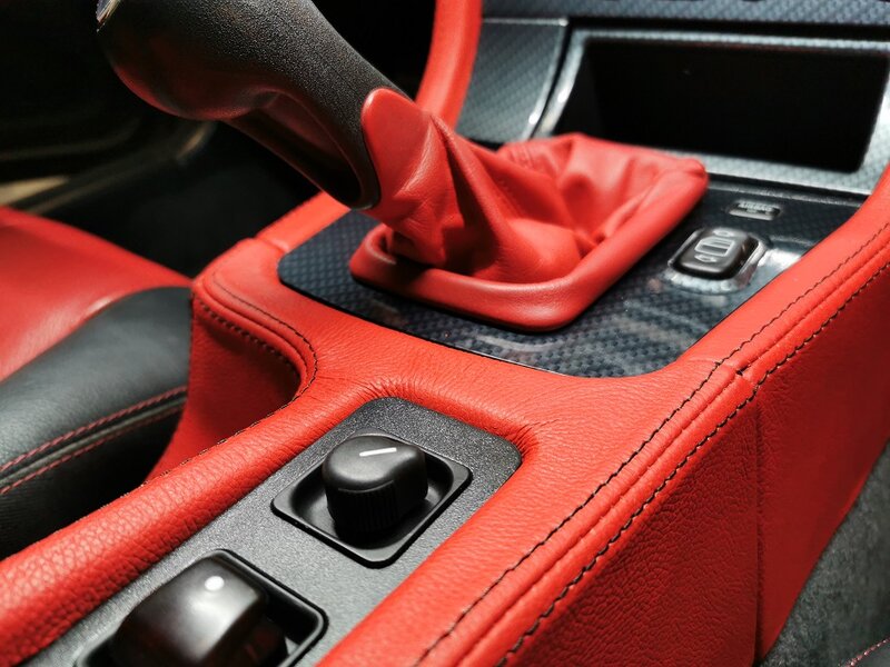 Der Innenraum des Mercedes wurde komplett demontiert und anschließend sämtliche Bauteile des Innenraumes wurden mit einem roten Echtleder bezogen.