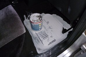 Autofahrer vergessen manchmal, die Deckel von Farbeimern zuzumachen. Dieser Kunde fuhr den ganzen Tag mit einem offenen Behälter im Auto und das ging an diesem Tag schief.