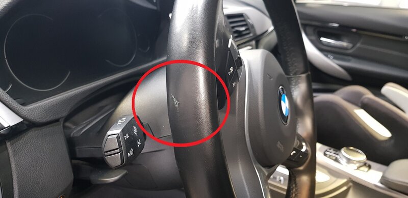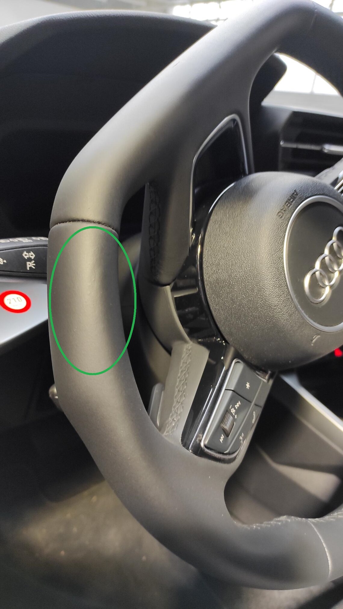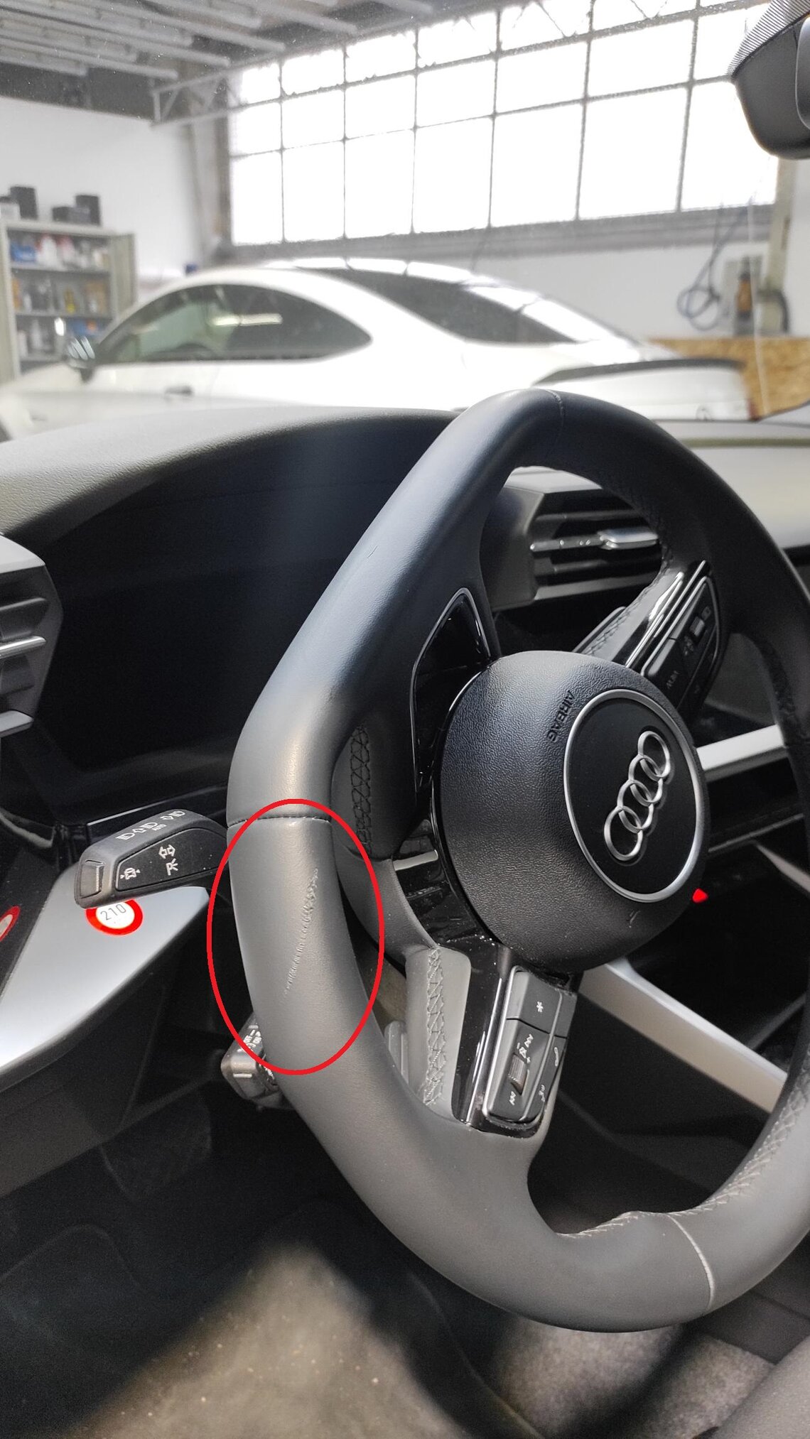 Ende Januar 2023 bucht die Kundin aus Gütersloh die Instandsetzung Ihres Lederlenkrads. sie störte sich überwiegend an einer verkanteten Stelle: "Die Macke macht mich ganz verrückt, wenn ich mit der Hand drübergehe...".