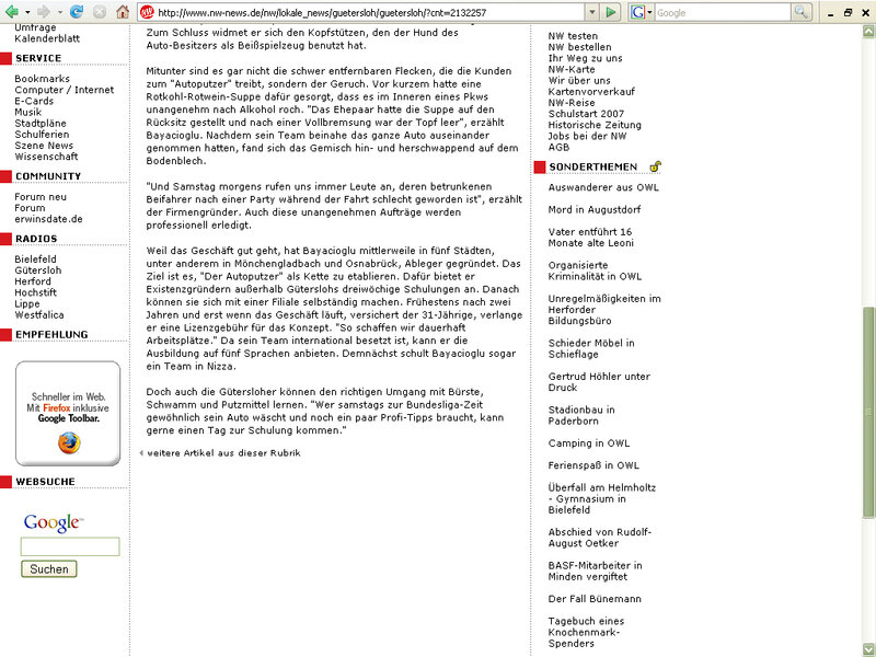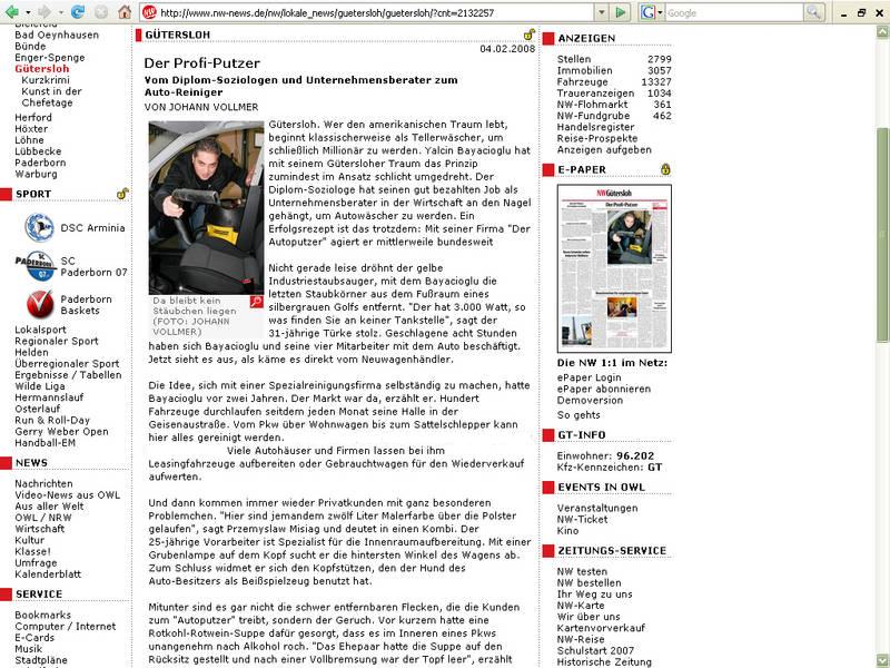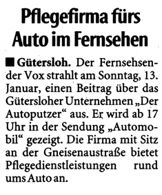 Am 12. Januar 2008 berichtet die Neue Westfälische Zeitung über den Autoputzer Fernsehbericht auf Vox TV: