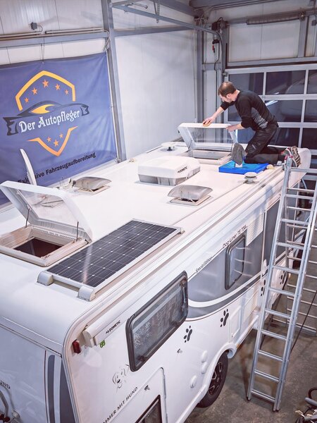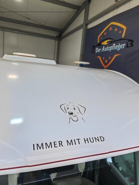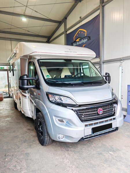Einmal Wohnmobil (Dog-Liner, Fiat Aufbau) bitte fertig machen! Der Kunde aus Anklam buchte eine professionelle Wäsche, Lackpolitur und eine Keramikversiegelung.