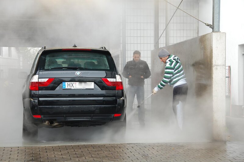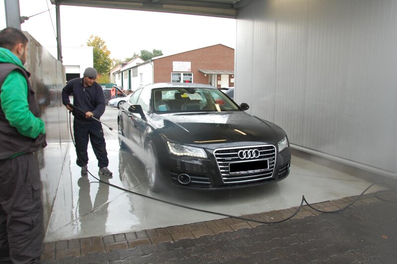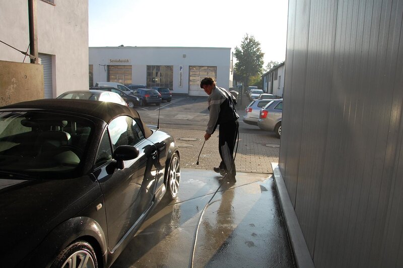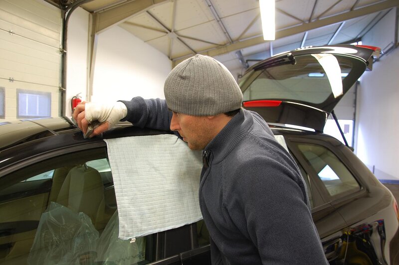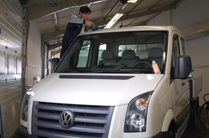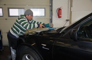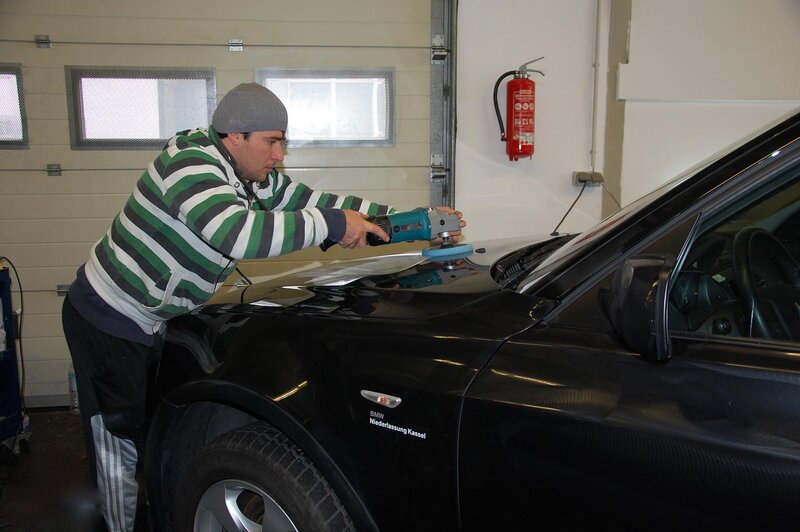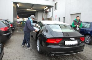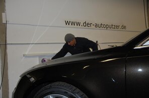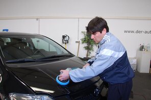 Nach der Einführung in die Theorie und Materialkunde, wurde sofort das erste Fahrzeug einer Vorbereitungsprozedur unterzogen: Vorarbeiten für die professionelle Autowäsche an einem Toyota Auris.