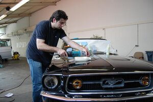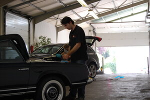 Herr Vasilikos hat an einem Ford Mustang V8 Cabriolet BJ 1967 Edelbrock Tuning und an einem Mercedes Benz 230 SL Pagode Cabriolet (1991 aus den USA importiert) gelernt, wie edle Oldtimer vom Lack her aufbereitet werden können.