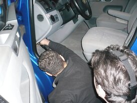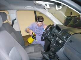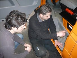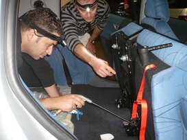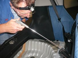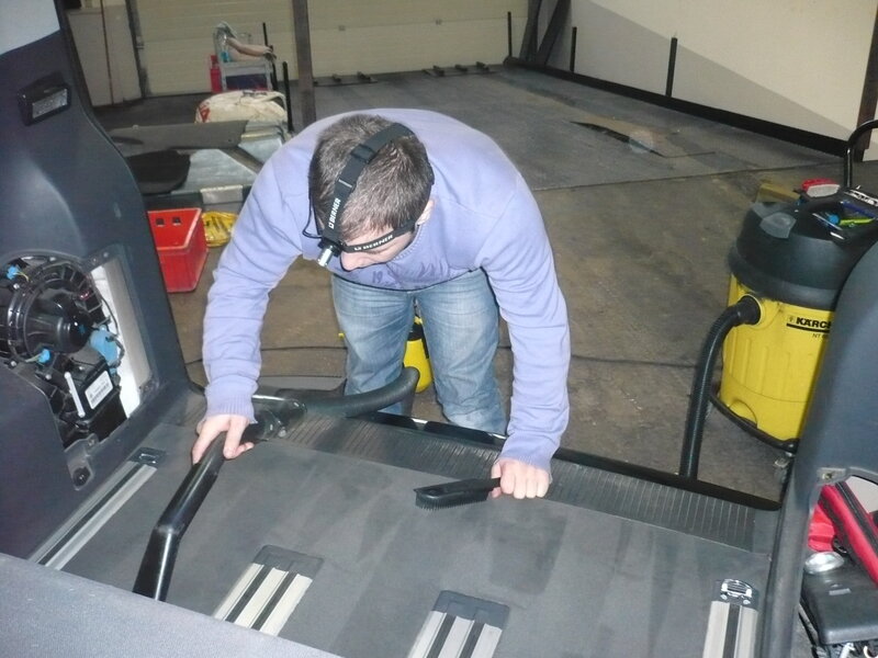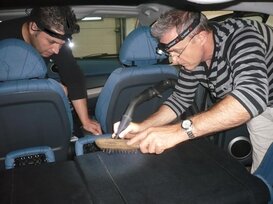 Herr Risch ist während der Schulung von Herrn Egon Abken zur Schulung "hinzugestoßen", so daß ausnahmsweise zwei Schüler Hand in Hand eine Großaufbereitung an einem Toyota RAV 4 durchführen konnten. Ziel war die Geruchsbeseitigung und die Nikotinentfernung in dem Toyota RAV 4, in dem auf Klimaanlagenbetrieb auf Umluft geraucht wurde.