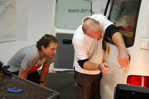An einem VW T5 hat er gesehen, wie eine große Delle durch den Beulendoktor entfernt wurde.
